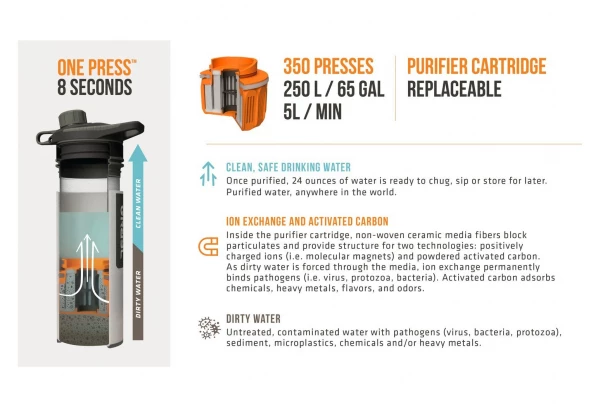 - Élimine : 99,99 % des virus (rotavirus, norovirus, hépatite A), 99,99999 % des bacteries (E.coli, Salmonelle, Dysenterie), 99,9 % des protozoaires (Giardia, Cryptosdoridium, Amibes).