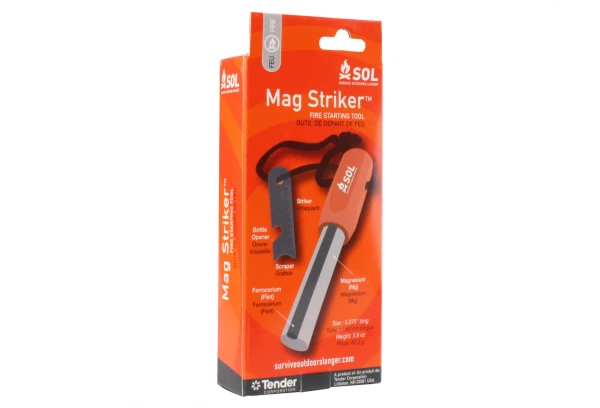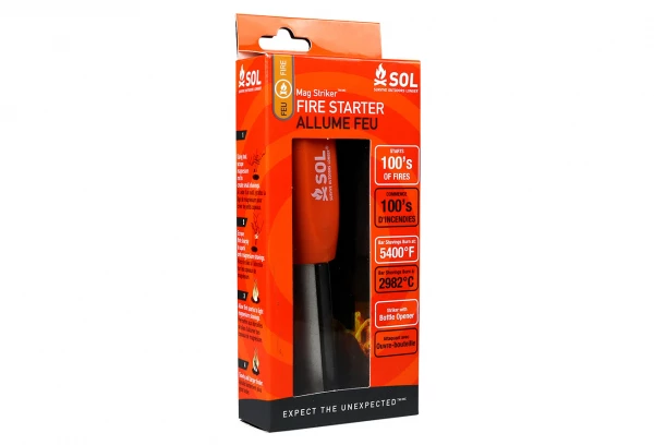 Pierre à feu de magnésium et grattoir avec ouvre-bouteille intégré. Permet d’allumer plus de 100 feux. Fonctionne par tous les temps.