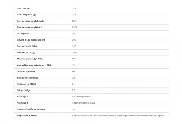 Une recette lyophilisée originale pleine d ‘énergie pour les repas des trekkeurs, les plats des skippeurs et l ‘alimentation des survivalistes comme pour les lunch box de tous les jours. Les plats déshydratés remplacent idéalement les conserves en plat individuel car plus goûteux, plus légers, plus compacts et ils se conservent plus longtemps.