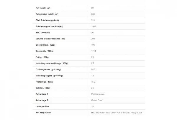 Riz précuit 75,6%, poulet cuisiné lyophilisé 10% (poulet, concentré de tomate, oignons, bouillon de volaille (OEUF), légumes, épices (MOUTARDE) et aromates), matière grasse (huile de tournesol, sirop de glucose, protéines de LAIT), sel, sauce indienne 1,25% (sel, épices et aromates), carottes, persil.
