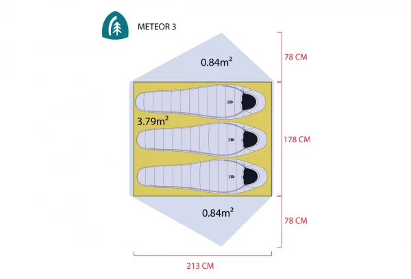 La meteor 3000 3 a une surface au sol de 3,79 mètres carrés, deux larges absides de 0.84 mètres carrés chacune, une hauteur de 106,68 cm.