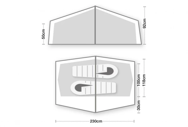- La condensation est gérée avec un panneau en maille dans la moitié supérieure de la porte intérieure et à l’extrémité de la tente.